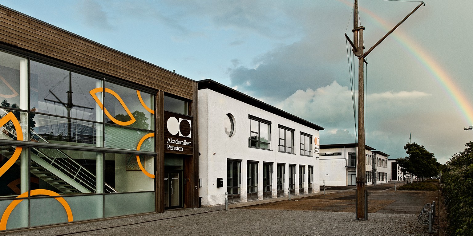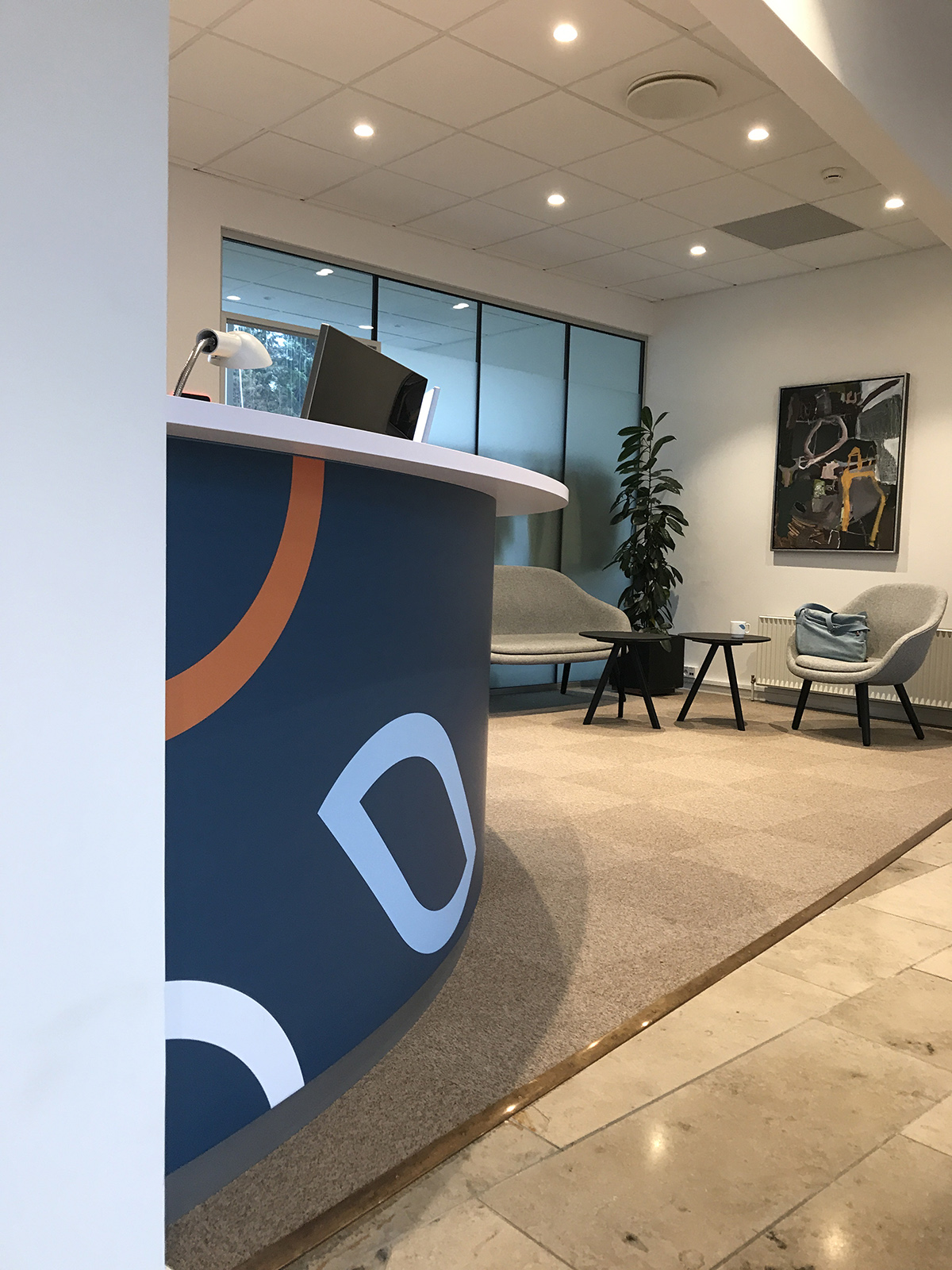 New name, new logo and new design should be implemented at the head office of Akademikerpension. A version of the logo specifically developed for signage combined with the use of circle segments became the basic elements in the branding on the property.